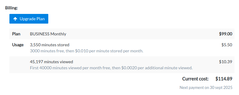 When you subscribe, you are billed in advance for the coming month or year of service at a rate that corresponds with your selected plan level. You are also billed for the previous month’s if you exceed the Video Hosting limits with the overage charges, if there are any. You will be billed on the same date each month unless you cancel your account, which you can do at anytime.